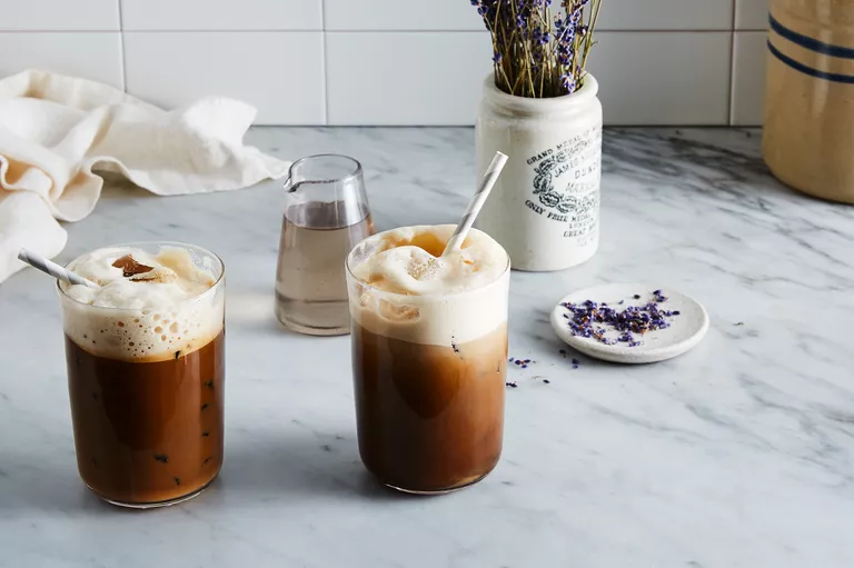 Divide the 1 cup of cold brew and the 2 cups of ice among two glasses. Then, fill your cocktail shaker with additional ice. Add the creamer or milk and the espresso powder and shake like crazy for at least 30 seconds. Strain into the two glasses, then sweeten with the lavender syrup to taste.