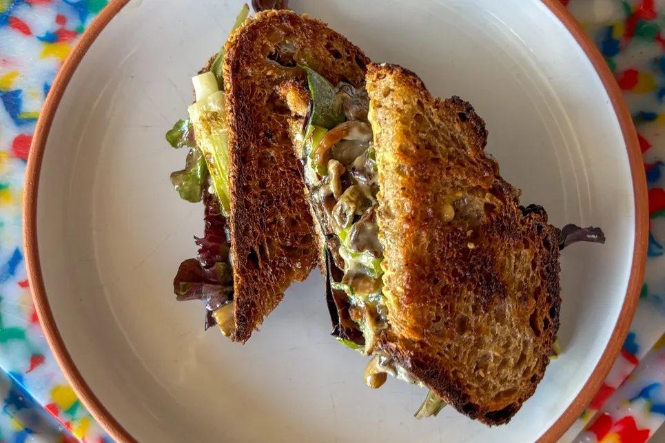 This sandwich has all the hallmarks of a great lunch: quick, easy, delicious, and ultra-satisfying. All it takes is a cast iron pan and your favorite cheddar cheese. I prefer using oyster mushrooms and hand shredding them, their size and shape lends to being piled up irregularly like good deli meat. Be sure to get good color on both the mushrooms and the scallions. I like this sandwich on sliced and toasted crusty sourdough but this would also be delicious on a fresh baguette.